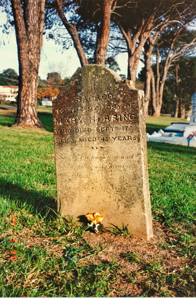 Mary Herring was accidently killed on 17th September, 1863 aged 45 years at Picton, NSW, leaving her husband and seven of her children to mourn her loss. Sometime after, James moved to Goulburn, NSW.